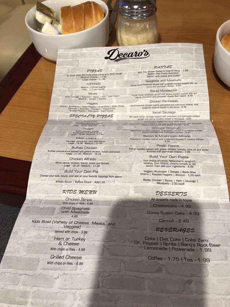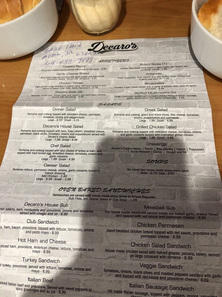 Welcome to Decaro's, your new favorite Italian pizzeria nestled in Alton, IL. This charming eatery offers an inviting atmosphere perfect for families, groups, or casual diners seeking delicious comfort food. With a menu that highlights traditional St. Louis-style pizza, you can expect a delightful array of toppings and flavors.